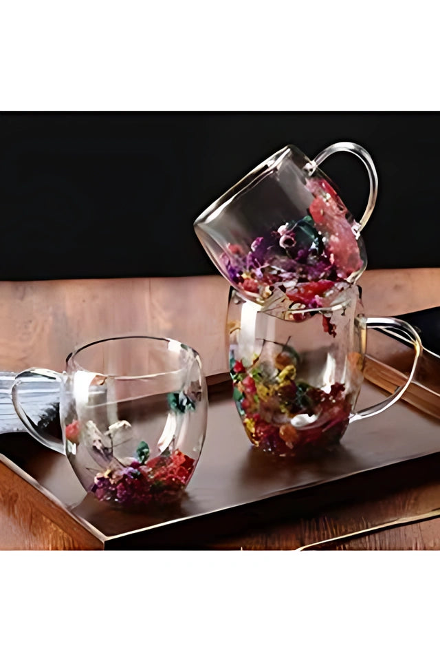 • Içerisinde özenle yerleştirilmiş kurutulmuş orijinal çiçekler, bardağa görsel bir estetik katmaktadır. Çift camlı yapısı içeceğin sıcak veya soğuk olmasına bağlı olarak izolasyon sağlar, böylece içeceklerin sıcaklığını daha uzun süre korur. Bu zarif kupa bardak, hem görsel açıdan çekici hem de içecek keyfini artıran özel bir deneyim sunar.
